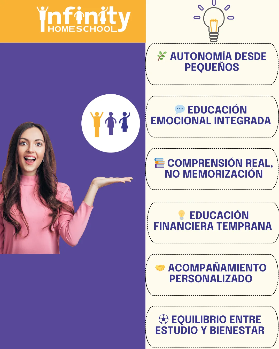 Infinity Homeschool promueve un modelo educativo centrado en el estudiante, que reconoce la diversidad de ritmos, intereses y estilos de aprendizaje. A través de trayectorias educativas flexibles, acompañamiento académico cercano y estrategias pedagógicas diversificadas, se favorece el desarrollo de la autonomía, el aprendizaje significativo y la construcción progresiva del conocimiento.